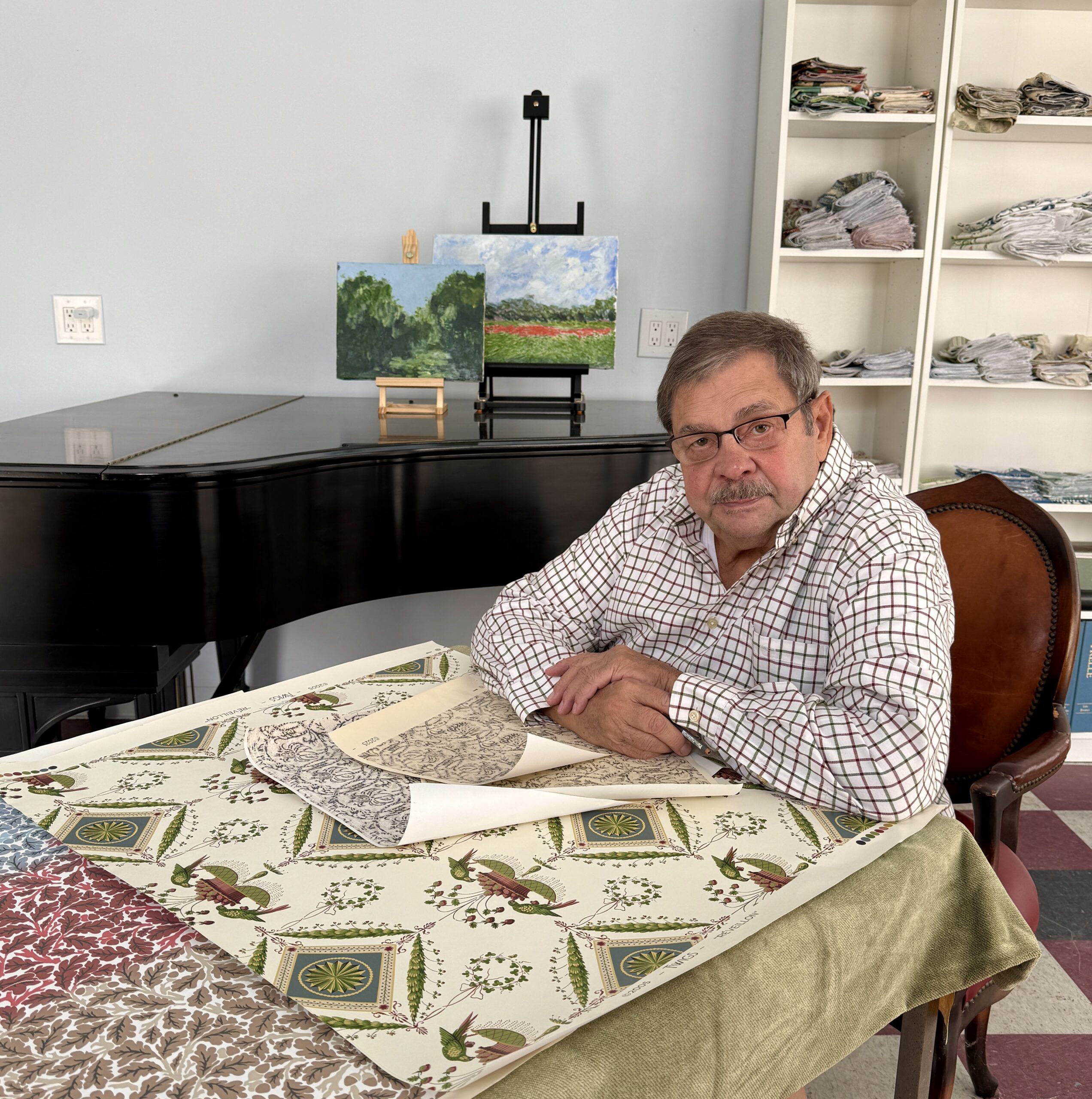 My passion for collecting and preserving antique textiles and wallpaper documents continues to this day. Inspiration is always around from my plein air painting in the South of France, Pays de la Loire as well as hours spent playing my beloved piano.