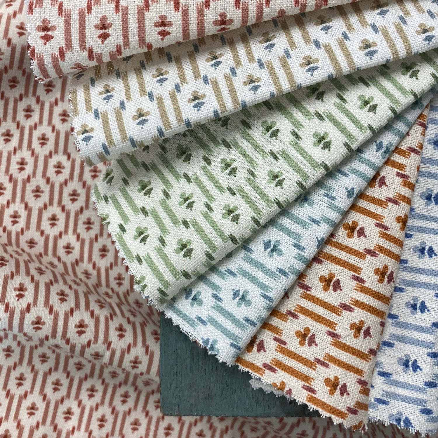 Olmo, Elney, Nettie, Reel Stripe, and Swing are printed on new cotton/linen, suitable for all soft furnishing and great for upholstery too. Charming Miss Polly, a delicately placed leaf design is printed on pure cotton with a light chintz glaze to add luster and body