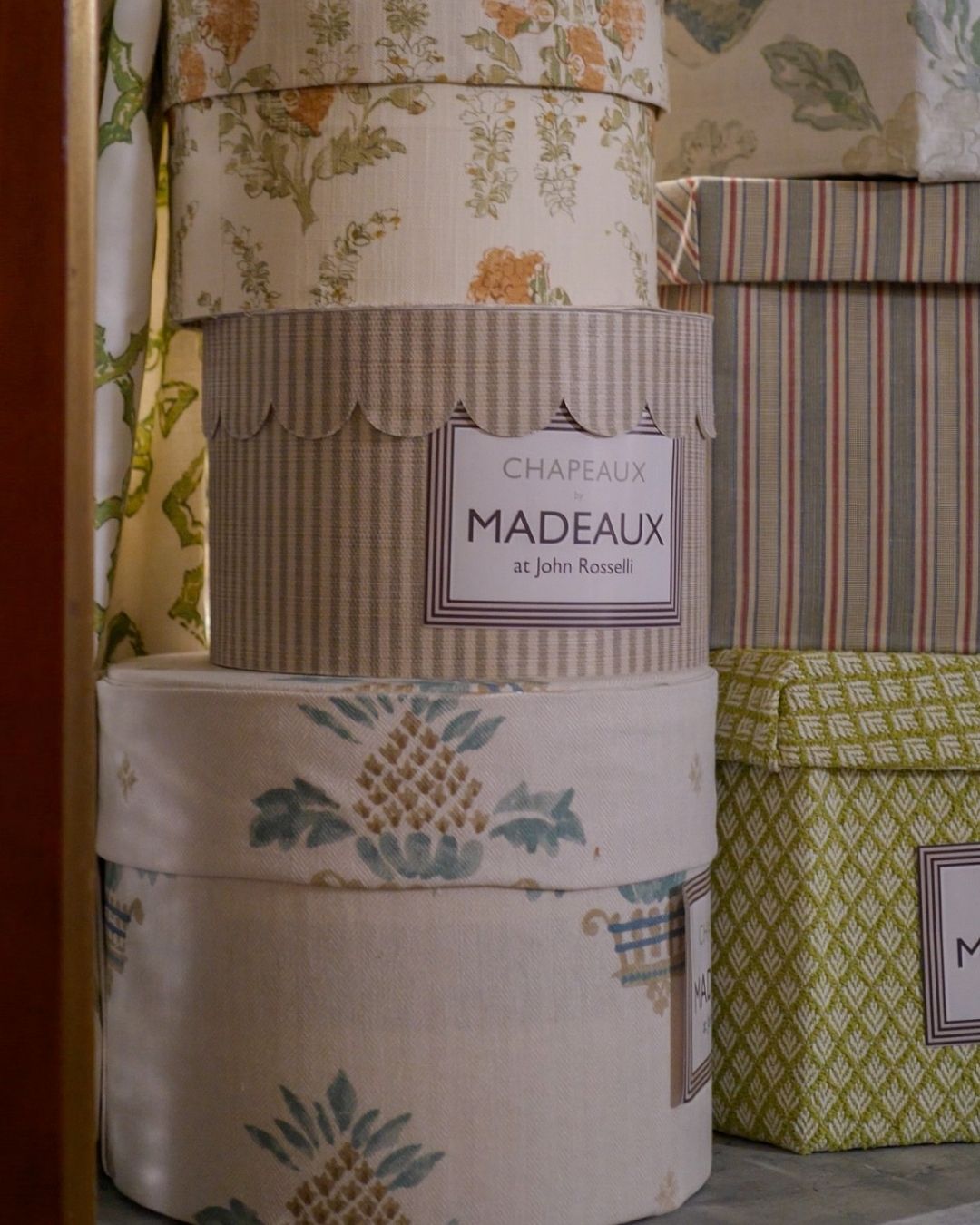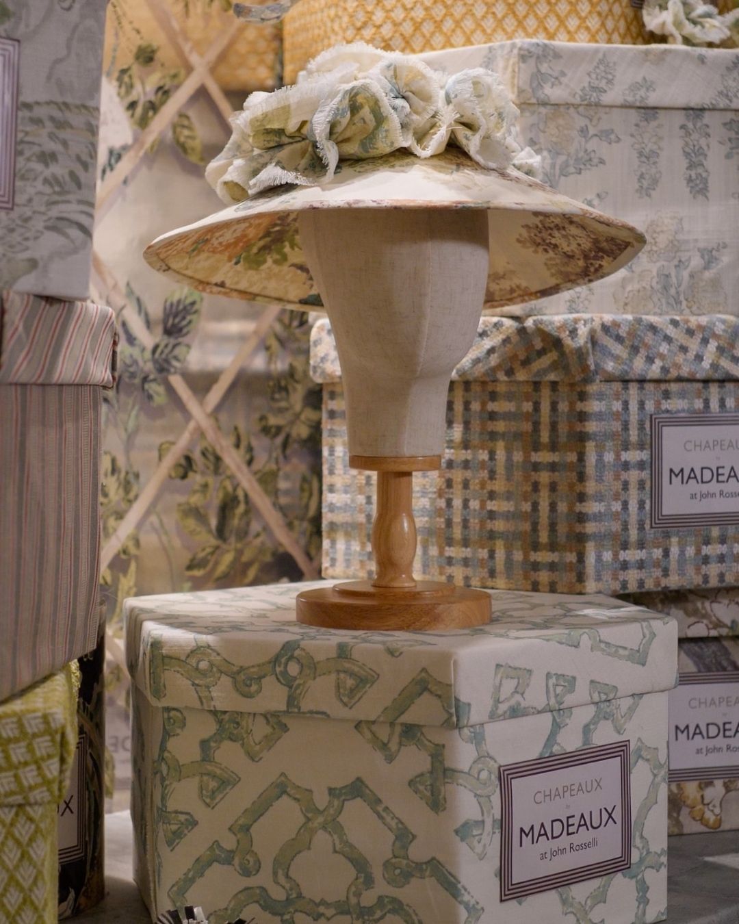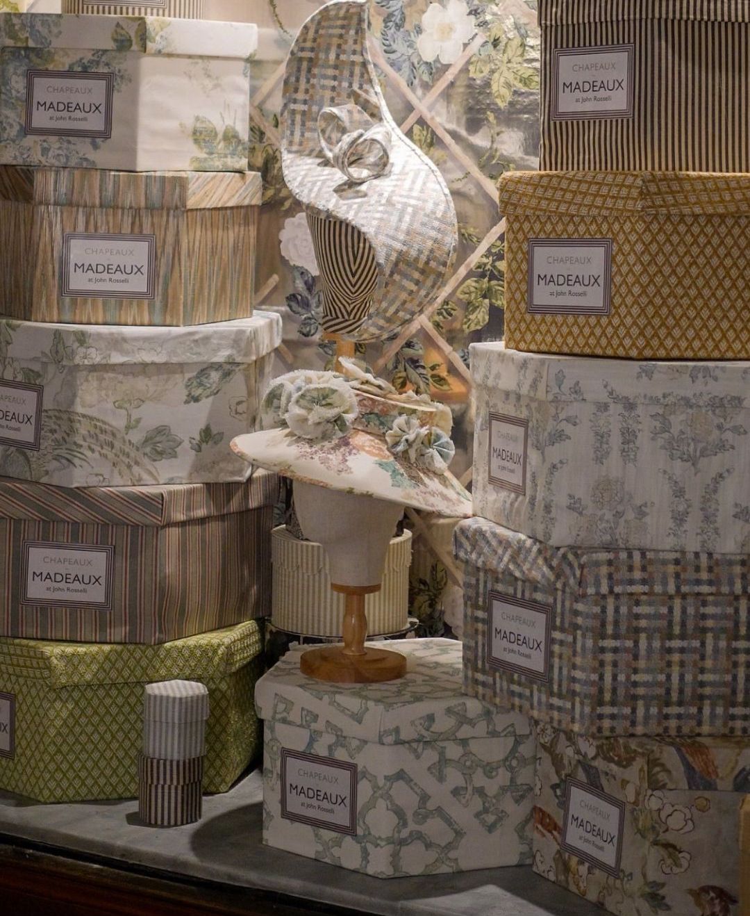 To celebrate this collection, we invited Madeaux to design a hat shop inside our D&D Building Window. Richard Smith titled the shop “Chapeaux Madeaux,” with hats inspired by the artistry of Philip Treacy. Stop by our window hat shop to discover a delightful array of fabric and wallpaper-dressed hats and boxes.