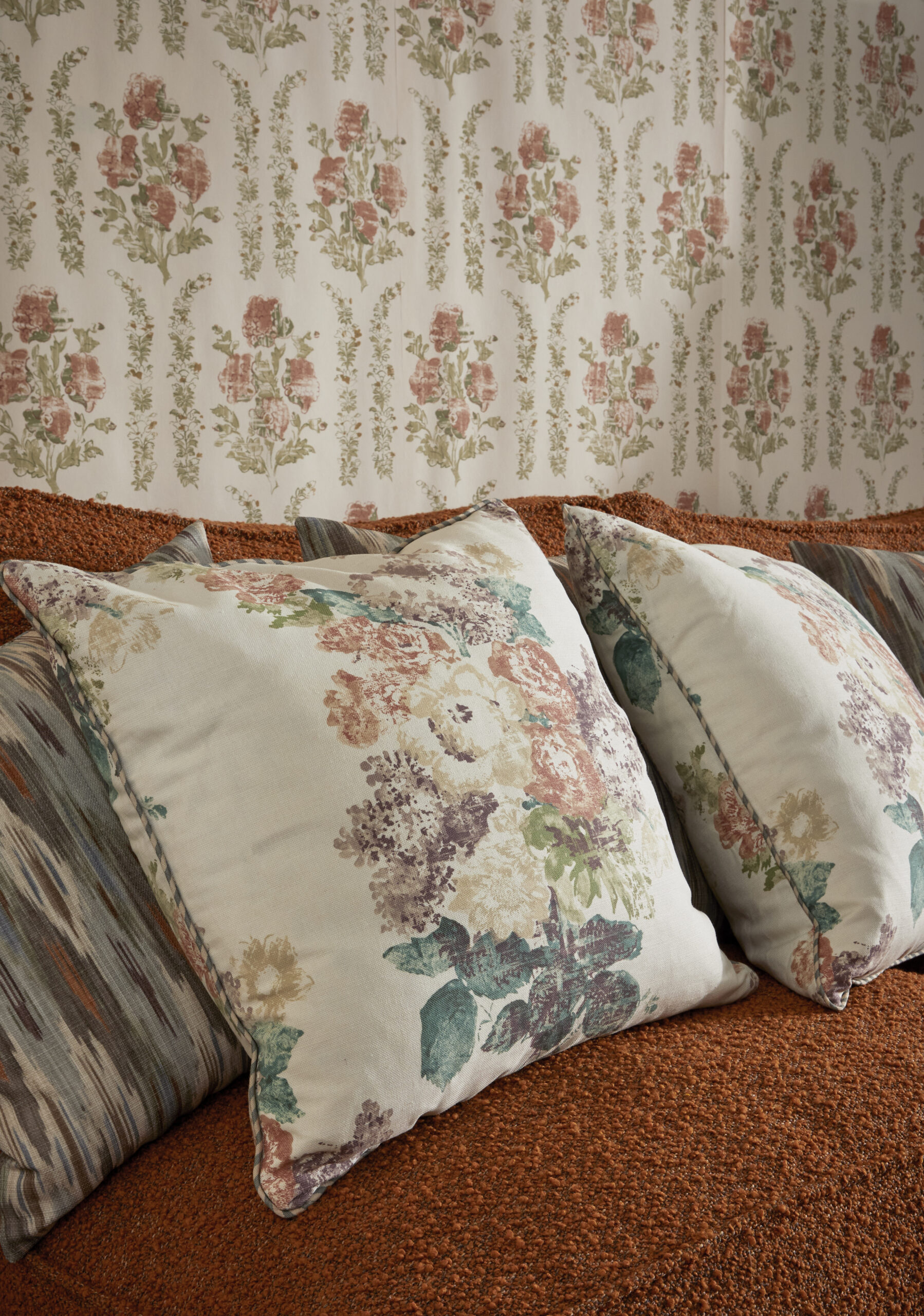 Flower Room: Large-scale flowers in a classic bouquet layout are softened by the texture of a vintage textile, creating this enchanting, ethereal addition to the collection. It could be dressed up with passementerie for a more classic look, or paired with plain linens and textures for an informal, romantic appeal. Printed on a linen mix.