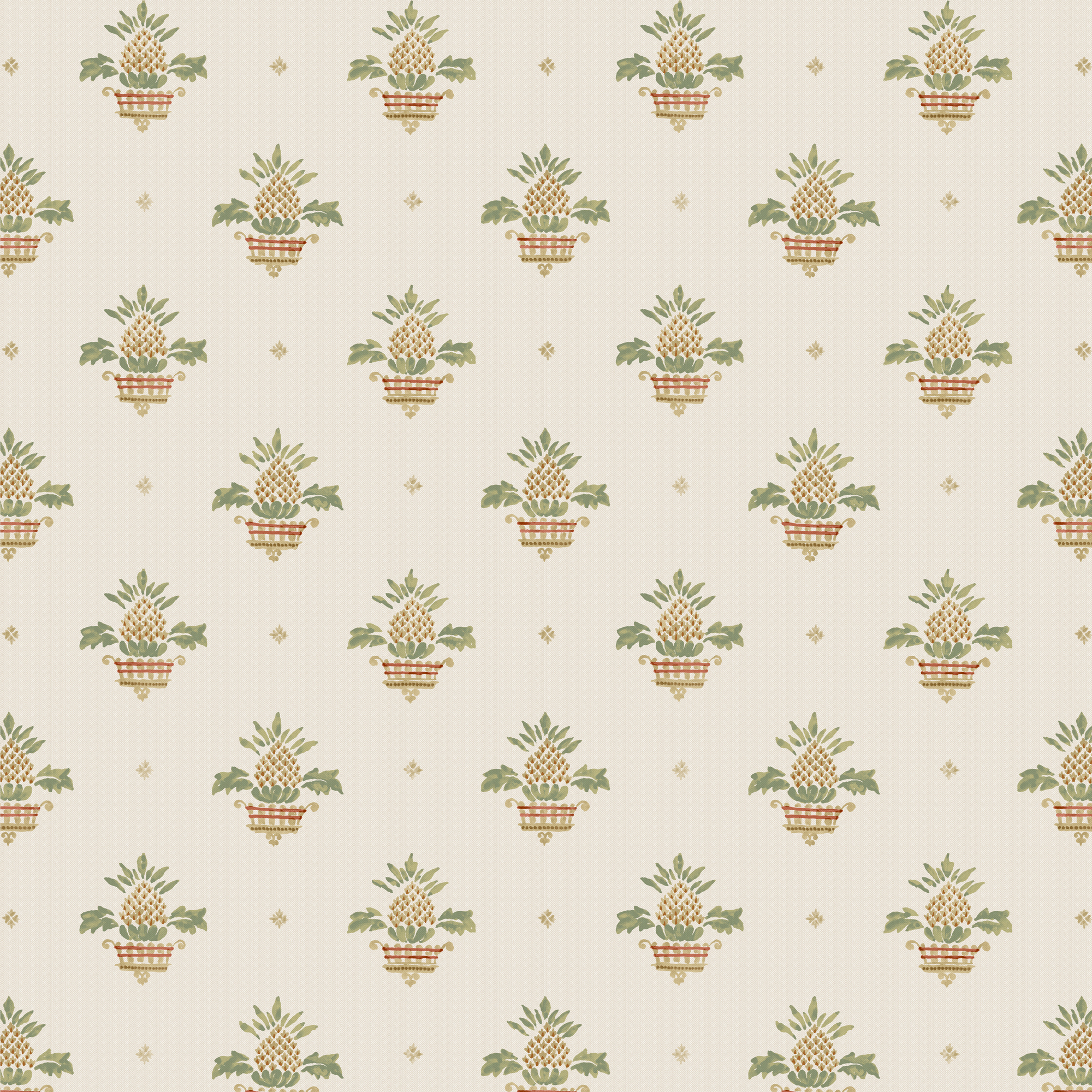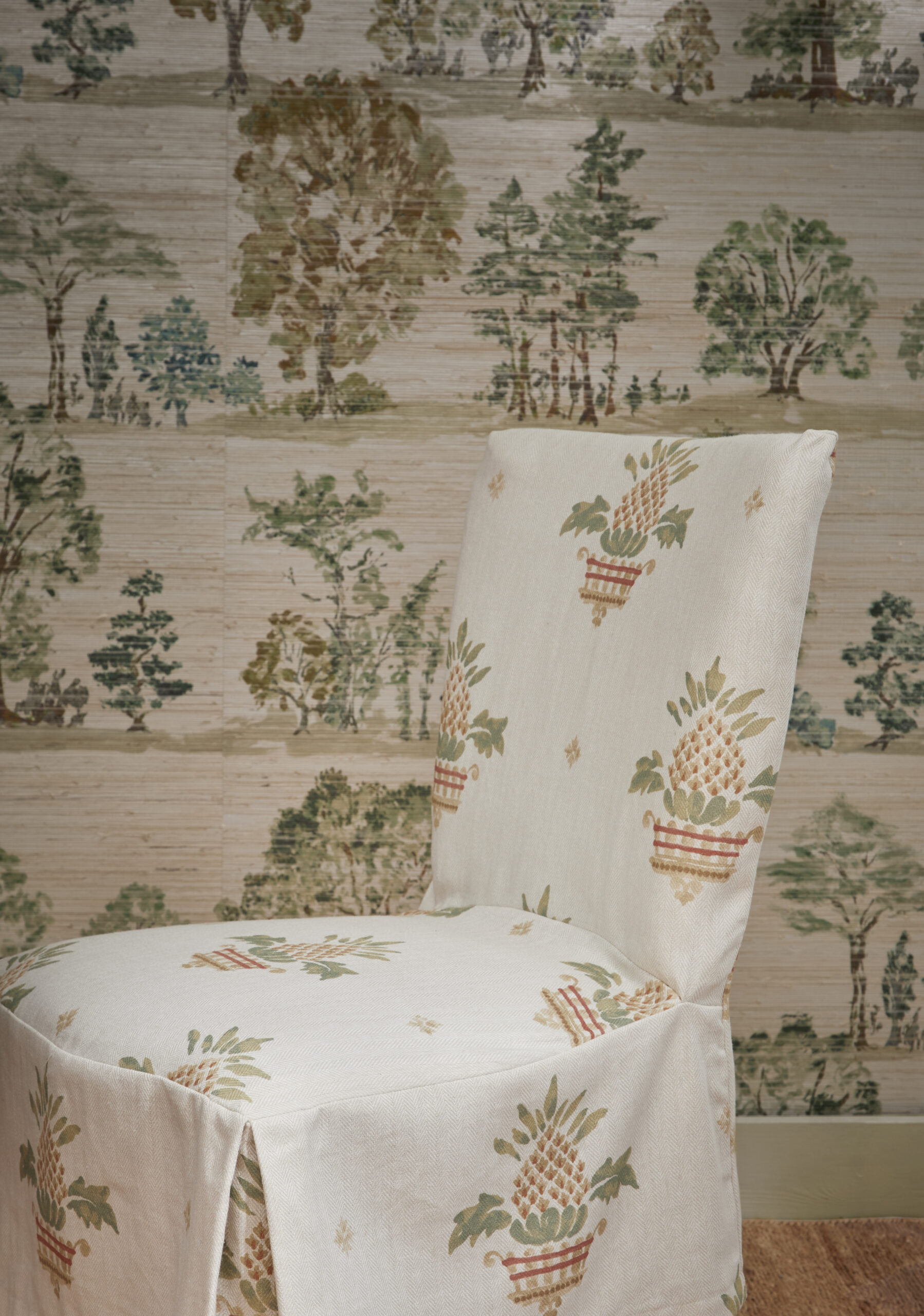 Pineapple Basket: Stencilled floors were a popular decorative touch in early colonial homes, as was the pineapple motif: not only a symbol of hospitality, the combination of the leaf crown with the fruit’s spiralling scales has always made for a stylish decorative device. Here, Madeaux placed it in a basket, painted in a naive style, with plenty of space to create an open layout.
